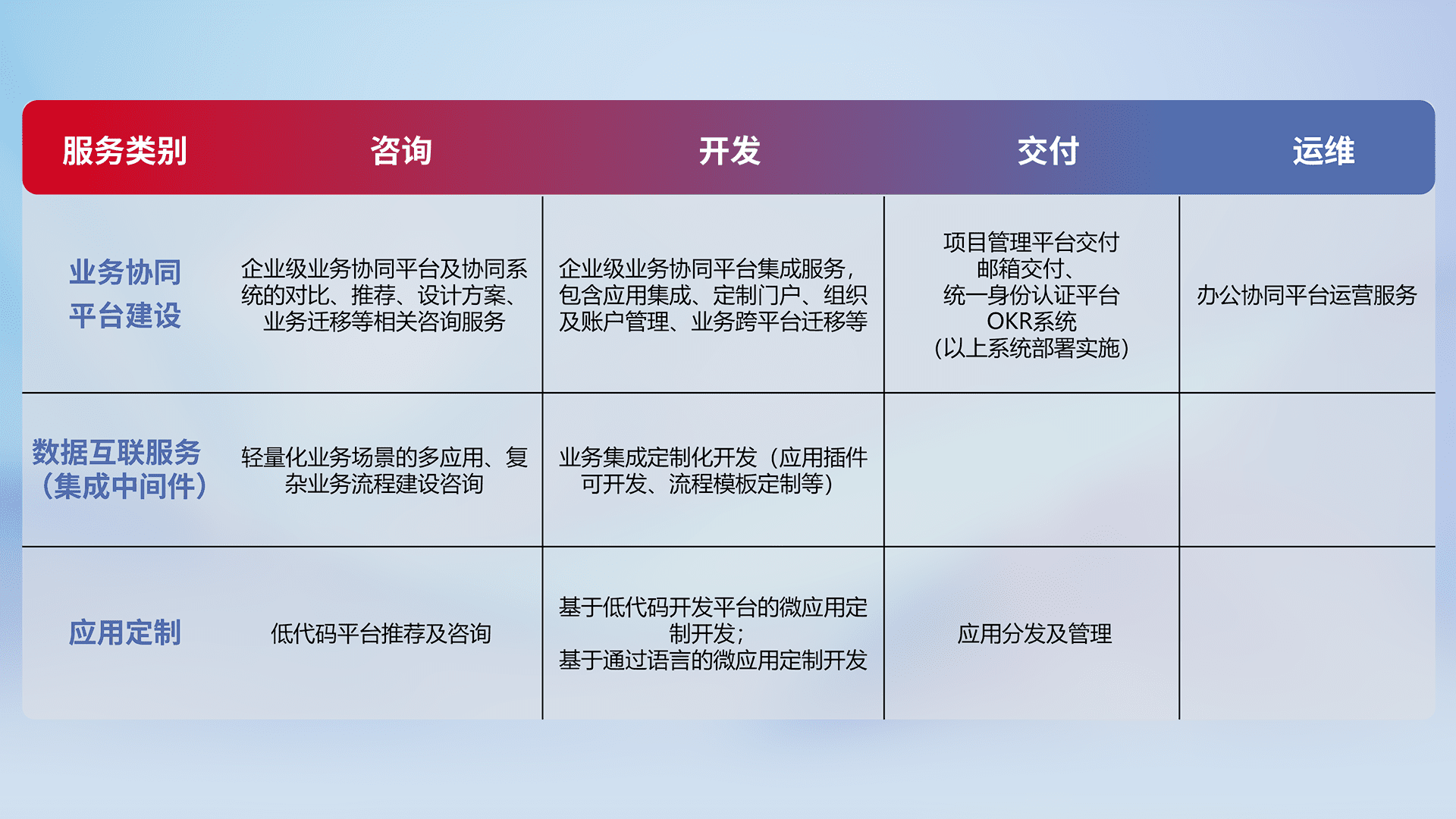 针对钉钉、、、、企微、、IDaas等平台级产品提供产品的规划、、、、方案、、、交付、、、定制化开发等服务,,实现如统一协同办公、、、、智能客户服务、、、混合会议管理、、、智能数据查询、、、、等业务场景,,,实现数字化转型。。。