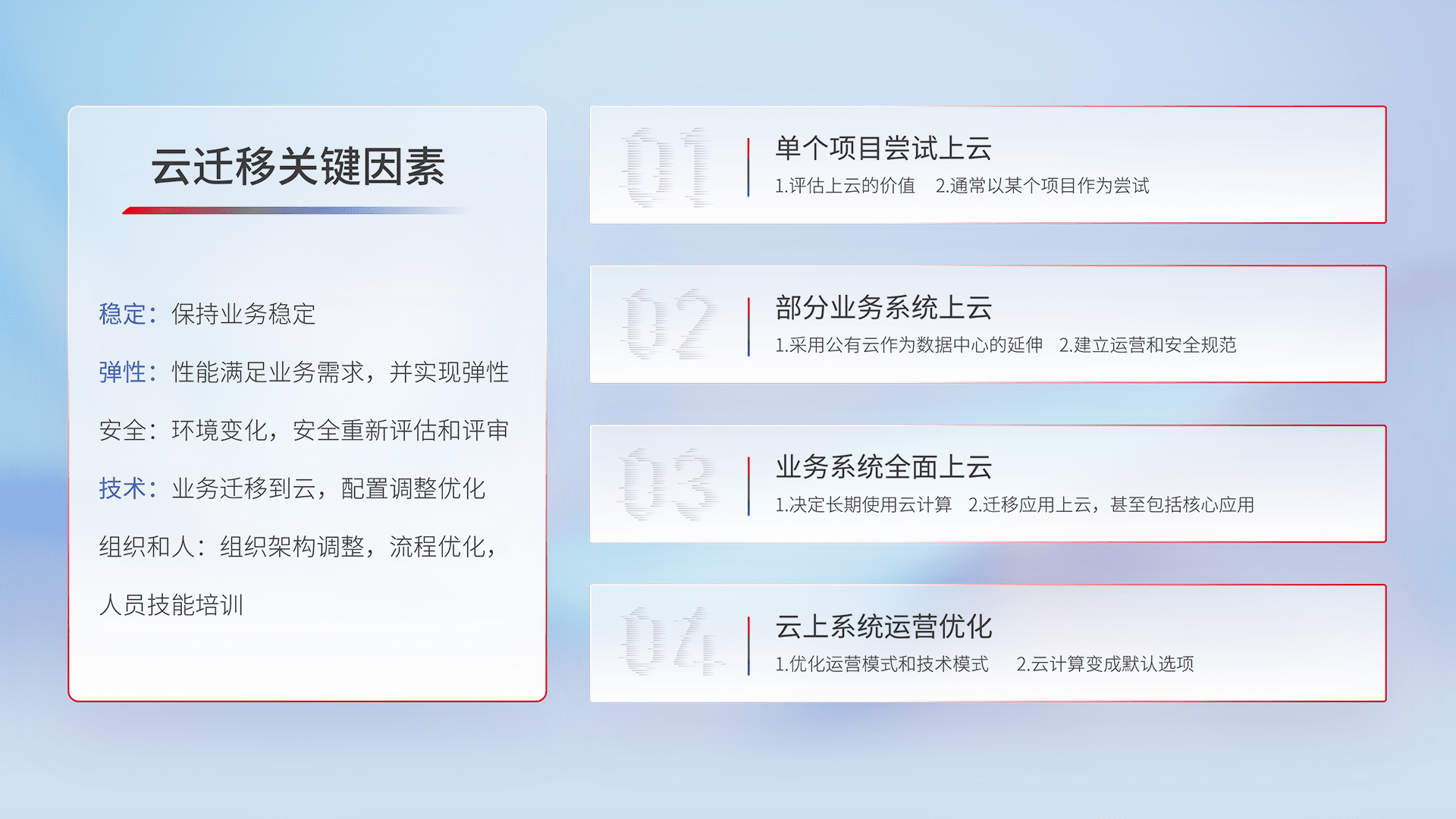 结合实际业务,,,从规划设计、、、云平台选型、、、、云原生改造、、数据迁移、、、集成交付,,,,迁移全过程为客户识别最佳上云路径,,,,做好风险识别管理,,,,设计网络架构、、、、身份权限、、、安全审计合规、、、、操作审计、、日志审计、、、、监控告警策略、、多站点容灾设计等,,,对云上基础设施进行整体规划,,,提升IT治理水平,,以满足弹性、、高可用、、、高性能的需求。。